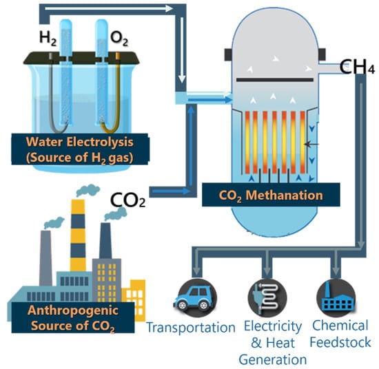 Today’s society faces significant challenges in terms of the energy crisis and climate change caused by global warming. The greenhouse gases (GHGs) which are responsible for the warming of the earth comprise approximately 68% carbon dioxide (CO2) [1]. Apparently, the natural equilibrium of CO2 is being disturbed as the concentration of anthropogenic sources increases with over 30 Gt emissions a year [1]. This primarily stemmed from the burning of fossil fuel and coal, as well as the industrial sector [2,3]. In order to mitigate the release of CO2 into the atmosphere, studies have been focusing on two approaches; to capture and store CO2 or to recycle the CO2 into valuable energy-bearing compounds [4,5]. The carbon capture and storage (CCS) is an interesting method that has been utilized by several oil and gas companies to reduce the CO2 release. Moreover, CO2 can also be retrieved and utilized as supercritical carbon dioxide for industrial chemical processes [6,7,8]. CO2 conversion into valuable products is also assuring, because it can reduce CO2 emissions and is more profitable for the industries involved with environmental issues [9,10], is also an alternative for hydrogen storage systems and is a renewable energy source via power-to-gas (P2G) technology.