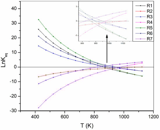 LnKeq versus T plot for R1–R8. (P = 1 atm, H2/CO2 ratio = 4).