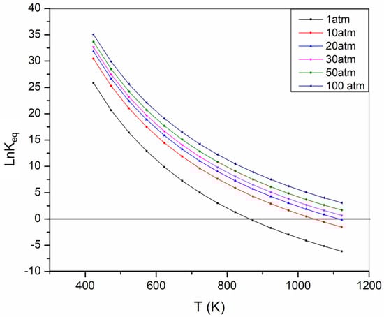 LnKeq versus T plot for CO2 methanation (R1) at different pressure (H2/CO2 ratio = 4).