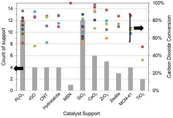 Even though Raney® Ni or Ni nanoparticles are active for carbon dioxide methanation, most of the studies involve the use of Ni nanoparticles supported on high surface area materials [35]. The strategy of adding support to the catalyst system can be explained by the fact that the support has a significant influence on the catalyst properties in a few aspects. Firstly, the presence of support can improve the dispersion of Ni nanoparticles; hence, the active sites will increase. In addition to that, since the adsorption of CO2 onto the catalyst is considered to be the critical step, the addition of support onto the Ni-based catalyst can improve adsorption [4]. Then, it can also decrease the sintering of nanoparticles by establishing a physical anchor between the support and Ni particles [78]. The activity and selectivity of supported Ni are strongly influenced by the amount of Ni metal loading, size of dispersed Ni metal particles, metal-support interaction, and the composition of support. Referring to Figure 4, often, ceramics supports, such as silica [50], mesostructured silica nanoparticles (MSN), aluminium oxide [37], and hydrotalcite [79,80] were investigated for CO2 methanation. Apart from that metal oxide supports, such as ZrO2, TiO2, and CeO2 are also widely studied. In more recent studies, the use of carbon-based support has begun to gain considerable attention in the CO2 methanation field [76,81].