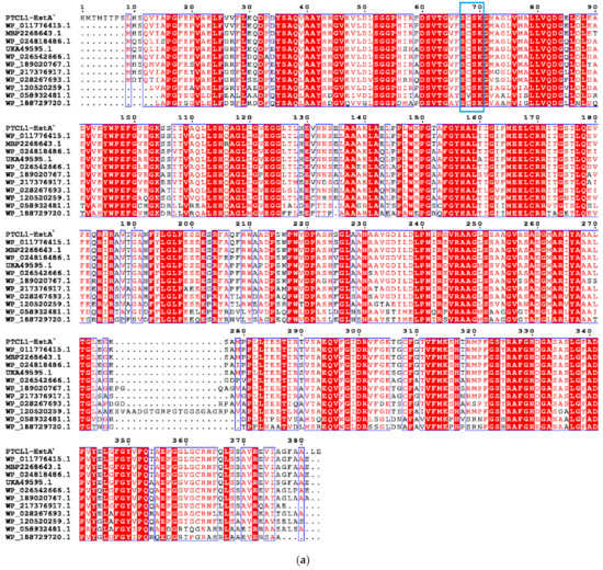 A BLAST search (http://blast.ncbi.nlm.nih.gov/Blast.cgi, accessed on 2 March 2022) with the PTCL1-EstA gene sequence indicated that the PTCL1-EstA gene had an open reading frame of 1152 bp, encoded a polypeptide of 383 amino acid residues, had a predicted molecular mass of 40,681.98 Da, and had a calculated isoelectric point of pH 5.12.