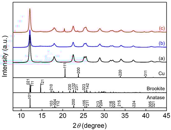 XRD patterns of (a) TiO2, (b) Cu-TiO2, and (c) Cu-TiO2-H. The simulated XRD patterns of anatase, brookite, and Cu are also presented.