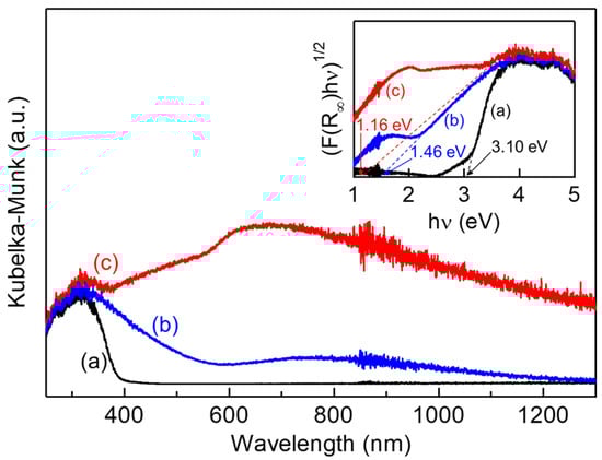 Diffuse reflectance spectra of (a) TiO2, (b) Cu-TiO2, and (c) Cu-TiO2-H samples. The inset is the Tauc plots for the determination of the bandgap of the samples.