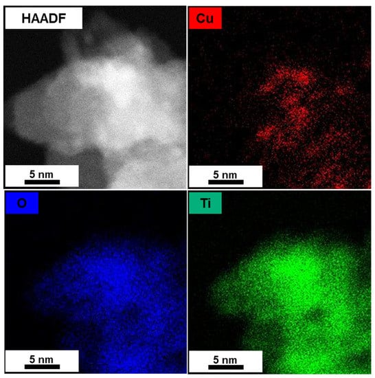 High-angle annular dark-field scanning transmission electron microscopy (HAADF-STEM) image and EDS mapping images of Cu-TiO2-H.