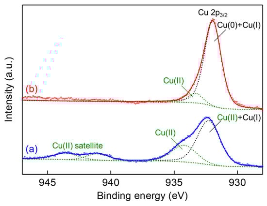 Deconvoluted Cu 2p3/2 XPS spectra of Cu-TiO2 (a) and Cu-TiO2-H (b). The observed spectra, fitting curves, calculated patterns, and deconvoluted curves are denoted by circle, solid line, and dashed line, respectively.