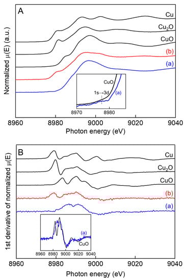 Cu K-edge spectra (A) and first derivative of Cu K-edge XANES spectra (B) of reference compounds. (a) Cu-TiO2, (b) Cu-TiO2-H. The inset figure shows overlay of the spectra of CuO and (a) Cu-TiO2.