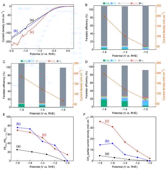 Electrochemical reduction of CO2 (ECO2R), which uses renewable electricity to produce fuels and chemical feedstocks from CO2, has attracted attention not only as an eco-friendly material synthesis process but also as a novel method to store intermittent renewable electricity which is generated from renewable energies such as solar, wind power, and so on []. Among metal catalysts, Cu is known to exhibit the highest activity in ECO2R [] and also produces multi-carbon products such as hydrocarbons and alcohols. Meanwhile, the selective production of CH4, which is widely used as a fuel, is a demanding task but has not been achieved to the desired level in ECO2R employing active Cu catalysts.