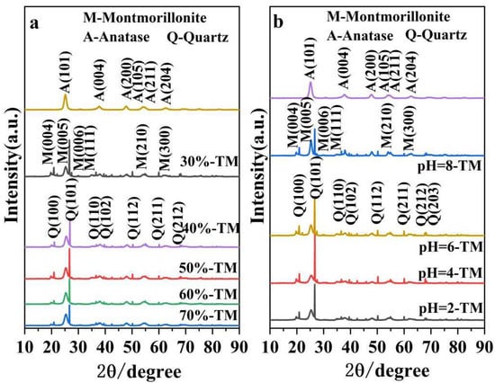 X-ray diffraction patterns of TiO2-montmorillonite (MMT) composites prepared using (a) different TiO2/MMT mass ratios at a reaction temperature of 160 °C, a dwelling time of 24 h, and a pH of 6, and (b) different pH values at a reaction temperature of 160 °C, a dwelling time of 24 h, and a TiO2 mass ratio of 30 wt%.