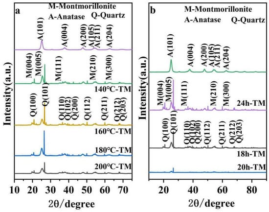 X-ray diffraction patterns of TiO2-montmorillonite (MMT) composites prepared using (a) different reaction temperatures with a dwelling time of 24 h, a pH of 6, and a TiO2 mass ratio of 30 wt%, and (b) different dwelling times at a reaction temperature of 160 °C, a pH of 6, and a TiO2 mass ratio of 30 wt%.