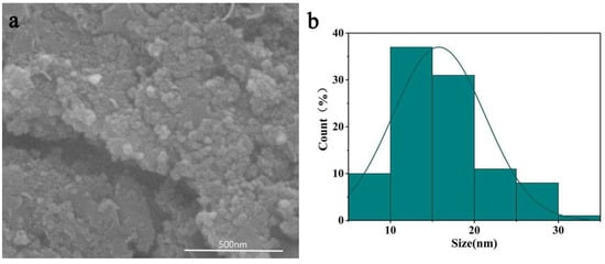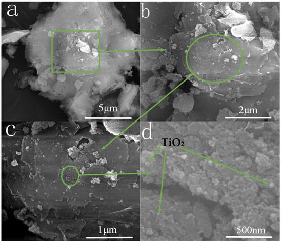 Figure 3 shows the SEM images of 30%-TM at different magnifications, revealing that the ordered lamellar structure of MMT remained intact after the hydrothermal reaction, and showing the presence of well-dispersed TiO2 nanoparticles on and between the MMT layers [33]. The corresponding particle size distribution (Figure 4) suggested that the TiO2 particles and their aggregates had sizes of 10–30 and 50–100 nm, respectively. These results implied that hybridization with TiO2 did not destroy the ordered interlayer structure of MMT, allowing complete utilization of the large interlamellar and surface area of the latter [34].