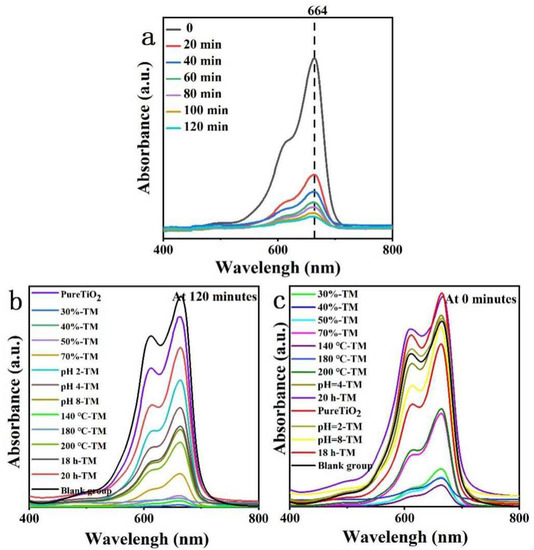 Ultraviolet–visible absorption spectra of methylene blue solutions degraded by (a) 30%-TM (degradation time = 0–120 min) and (b,c) TiO2-MMT composites synthesized under different conditions (degradation time = (b) 120 min and (c) 0 min).