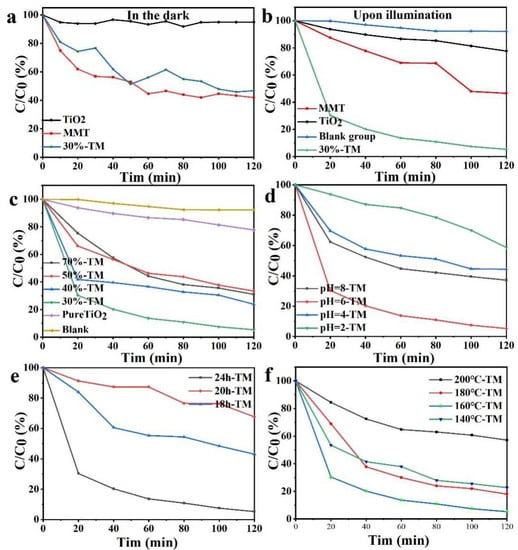 Methylene blue degradation curves obtained for (a) TiO2, montmorillonite (MMT), and 30%-TM under dark conditions; (b) the blank group, TiO2, MMT, and 30%-TM under visible light; (c) composites with different TiO2 contents prepared at a reaction temperature of 160 °C, a dwelling time of 24 h, and a TiO2 mass ratio of 30 wt%; (d) composites prepared at different pH values with a dwelling time of 24 h, a pH of 6, and a TiO2 mass ratio of 30 wt%; (e) composites prepared with different dwelling times at a reaction temperature of 160 °C, a pH of 6, and a TiO2 mass ratio of 30 wt%; and (f) composites prepared at different reaction temperatures with a dwelling time of 24 h, a pH of 6, and a TiO2 mass ratio of 30 wt%.