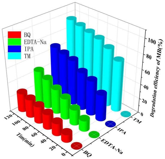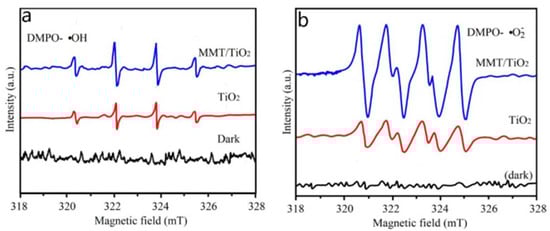 To probe the mechanism of catalytic MB degradation, we used active species trapping experiments (Figure 9). In particular, 5,5-dimethyl-pyrroline N-oxide (DMPO, a spin trapping agent) reacted with photogenerated holes (h+) to produce the radical cation DMPO+, which subsequently reacted with water molecules to form DMPO-OH•. The signals of spin adducts were predictably weak in the dark and became more intense when irradiated with light. A typical four-line electron paramagnetic resonance (EPR) signal of DMPO-OH• (g = 2.0057, intensity ratio = 1:2:2:1) was observed for all samples after irradiation and was more intense for TiO2-MMT composites than for pure TiO2, which implied that MMT remarkably enhanced the ability of TiO2 to produce ·OH radicals (Figure 9a).