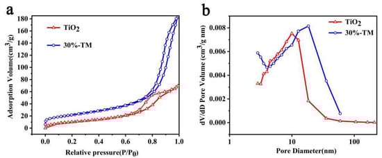 By testing the N2 adsorption–desorption isotherms of TiO2 and 30%-TM, the specific surface area of these catalysts was obtained. As shown in Figure 11a, it can be seen that TiO2 and 30%-TM displayed characteristic Type IV isotherms, and the shape of the hysteresis loop for these isotherms was Type H3, according to the International Union of Pure and Applied Chemistry (IUPAC) classification [49]. Besides, the BET surface area of 30%-MT was 77.069 m2/g, which was a larger surface area than pure TiO2. The pore volume and pore diameter were 0.2489 cm3/g and 15.192 nm, respectively (Figure 11a and Table 3). Furthermore, Figure 11b shows the pore diameter distribution curves, showing that the 30%-TM featured a shift in the distribution curve to larger pore sizes and the broadening of its shape. Therefore, the surface of 30%-MT can provide more active reaction sites.