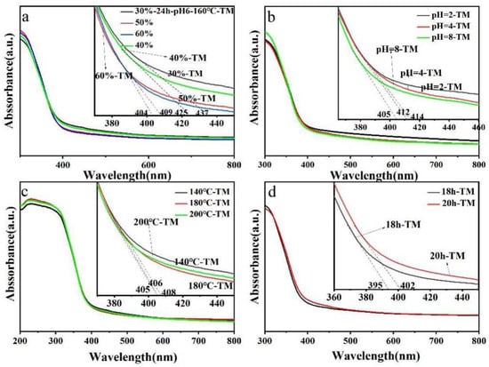 Ultraviolet-visible absorption spectra of TiO2-montmorillonite (MMT) prepared using (a) different TiO2/MMT mass ratios at a reaction temperature of 160 °C, a dwelling time of 24 h, and a pH of 6; (b) different pH levels with a reaction temperature of 160 °C, a dwelling time of 24 h, and a TiO2 content of 30 wt%; (c) different reaction temperatures with a dwelling time of 24 h, a pH of 6, and a TiO2 mass ratio of 30 wt%; and (d) different dwelling times at a reaction temperature of 160 °C, a pH of 6, and a TiO2 mass ratio of 30 wt%. Inset images show expansions of the 370–450 nm region.
