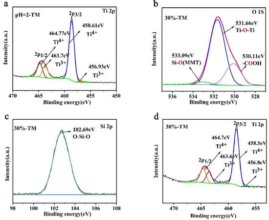 (a) XPS spectra (Ti 2p) of pH = 2-TM, and XPS spectra of 30%-TM. (b) O 1s; (c) Si 2p; (d) Ti 2p spectra.