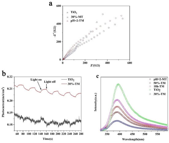 (a) EIS Nyquist plots of TiO2, 30%-MT, and pH = 2-MT. (b) Transient photocurrent responses of TiO2 and 30%-MT. (c) Analysis of PL of TiO2, 30%-MT, pH = 2-MT, 50%-TM, and 18 h-TM.