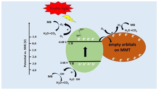 Compared with TiO2, the number of oxygen vacancies in the composites increased markedly, indicating that it was easier to generate oxygen vacancies on the MMT’s surface supported by TiO2. These changes could be attributed to the combination of the Si–O bond (in the Si–O tetrahedron on the MMT’s surface) and the TiO2 hydrosol that formed the Si–O–Ti bond [19,54]. Cheng et al. reported that oxygen vacancies and Ti3+ content affected the band gap of TiO2 matrix composites [19,54,56,57]. Thus, the changes in the band gap of TiO2 matrix composites is mainly related to the number of oxygen vacancies and the content of Ti3+ in the material. In TiO2-MMT composites, TiO2 acts as a photocatalyst, producing electrons (e−) and holes (h+) under illumination. The electrons pass through the band gap and then enter the CB, leaving holes in the VB [58]. Compared with pure TiO2, composites with MMT featured lower band gaps, thus favoring the injection of electrons into the CB. In the composite of TiO2 and MMT, the electrons in the CB react with Ti4+ to form Ti3+, which is considered the most reactive site in the oxidation process because it can produce more oxygen vacancies to facilitate the adsorption of O2 on the TiO2’s surface [59]. The adsorbed O2 molecules then react with electrons to produce highly reactive ·O2− species. Simultaneously, several electrons occupy the empty d-orbitals of metal ions in the MMT’s structure [28], which indirectly delays the electron–hole recombination and then reacts with O2 to produce ·O2− [60]. The holes react with water or adsorbed hydroxyl ions to form hydroxyl radicals (·OH). Both ·O2− and ·OH are strong oxidants that can destroy organic molecules [61] on and near the TiO2′ surface. Thus, the photocatalysis mechanism can be represented by the following equations: