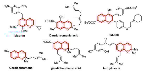 2H-chromene constitutes an important class of unsaturated 1-benzopyrans. Particularly, 2-substituted 2H-chromene is a privileged structural motif of numerous biologically active natural products and synthetic compounds [,,]. Figure 1 lists some representative molecules incorporating this structural motif. Iclaprim is well known for its selective inhibitory activity against microbial dihydrofolate reductase and has been used to cure complicated skin or respiratory infections []. Naturally occurring Daurichromenic acid, isolated from the leaves of Rhododendron dauricum, exhibits promising anti-HIV activity []. EM-800 is a highly effective nonsteroidal antiestrogen for the treatment of breast cancer []. Cordiachromene possesses antibacterial properties and inhibitive effects against cyclooxygenase []. Gaudichaudianic acid is described as a potential anti-trypanocidal agent []. Anthyllisone is a suitable candidate nonsteroidal anti-inflammatory agent by decreasing NO release without cytotoxicity []. In addition to these, 2H-chromene derivatives also find interesting applications in the fields of photochromic materials and laser dyes [,].