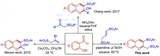 Metal-free synthesis of 2-functionalized 3-sulfonyl-2H-chromenes (Chang work [], Menon work [] and this work).