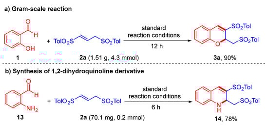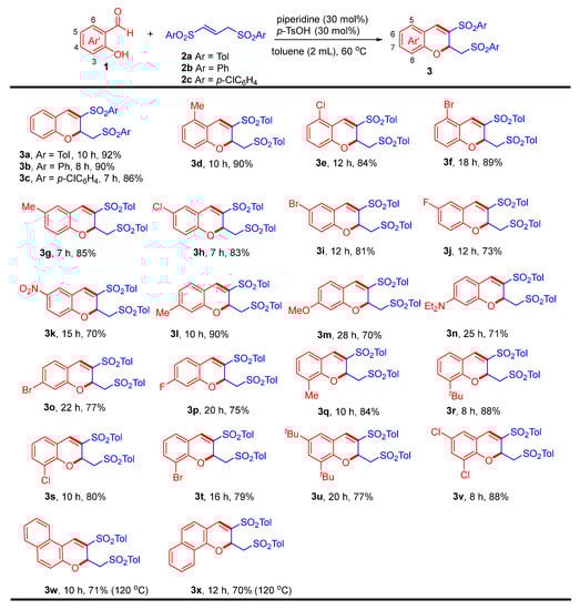 We initiated our study by exploring the reaction between salicylaldehyde and 1,3-bis(p-tolylsulfonyl)propene 2a in toluene under the catalysis of 0.3 equivalent of DBU at 90 °C for 8 h. Although 2a could be completely converted, 3-tosyl-2-(tosylmethyl)-2H-chromene 3a was obtained with a very poor yield (Table 1, Entry 1). Replacing with Cs2CO3 still provided a low yield. Even though using a stoichiometric amount of Cs2CO3, the yield remained unsatisfactory (Entry 2). Next, we turned our attention to nucleophilic amine catalysts. Although no yield enhancement was observed by treating the reaction with 30 mol% of piperidine, we were delighted to observe that when an equal equivalent of AcOH was added, the yield was drastically increased to 77% within a shorter period of reaction time (Entries 3 and 4). For comparison, AcOH showed no catalytic activity in the absence of any bases (Entry 5). Having identified the synergistic catalytic effect of a Brønsted acid, a quick survey including benzoic acid, trifluoroacetic acid (TFA), and p-toluenesulfonic acid (p-TsOH) was conducted, and p-TsOH was revealed to be a better choice (Entries 6–8). As expected, p-TsOH alone showed no catalytic activity (Entry 9). Next, the screening was on the cooperation between different amine bases and p-TsOH. It was found that pyrrolidine provided a slightly lower yield, whereas other bases such as 1,4-Diazabicyclo [2.2.2]octane (DABCO), NH4OAc, and pyridine were less effective or ineffective (Entries 10–13). Other reaction parameters, including the catalytic amount of both the p-TsOH and piperidine, solvent, reaction temperature, mole ratio, substrate concentration, and effect of water scavenger, were then screened (for details, see Table S1 in Supplementary Materials). When the reaction was conducted with 0.24 mmol of salicylaldehyde and 0.20 mmol of 2a in 2 mL of toluene at 60 °C, the product yield could be improved to 92% (Entry 14). In contrast, just reversing the mole ratio of starting materials caused a 12% loss in yield (Entry 15 vs. 14). Considering both the product yield and reaction time, the optimal reaction conditions were finally affirmed, as illustrated in Table 1, Entry 14.