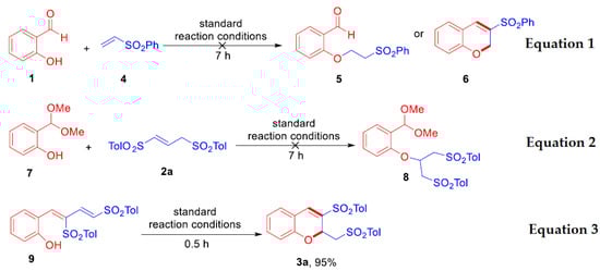 Since the reaction intermediates could not be isolated during the reaction process, control experiments were performed to help better understand the sequence in which Knoevenagel condensation and oxa-Michael addition take place (Scheme 3). We first conduct the reaction of 1 with phenyl vinyl sulfone 4 under the current reaction conditions. Phenyl vinyl sulfone 4 can be viewed as an analog of 2a yet with a more reactive and less hindered β site for the Michael addition of phenolic OH. However, no generation of oxa-Michael adduct 5 or annulation product 6 was observed (Scheme 3, Equation (1)). Then, salicylaldehyde dimethyl acetal 7, which can be viewed as salicylaldehyde bearing a masked formyl group and an exposed phenolic hydroxyl group with stronger nucleophilicity, was subjected to the reaction with 2a. Likewise, oxa-Michael adduct in the form of compound 8 was failed to produced (Scheme 3, Equation (2)). This outcome shows that the cascade process would unlikely be triggered by oxa-Michael addition. The very poor nucleophilicity of salicylaldehyde in conjugated addition has also been mentioned in literature before []. Moreover, we have also prepared Knoevenagel condensation intermediate 9 by condensation of 2a with tert-butyldimethylsilyl (TBDMS) group-protected salicylaldehyde followed by deprotection. This phenol derivative could be smoothly converted into 3a in excellent yield (Scheme 3, Equation (3)), which indicates in another way that Knoevenagel condensation would occur first.