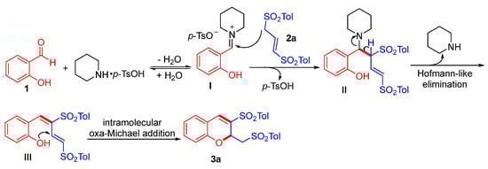 On the basis of this fact, a plausible reaction mechanism is proposed in Scheme 4. Salicylaldehyde is first condensed into iminium ion pair I by interaction with piperidine and p-TsOH. Intermediate I suffers a nucleophilic attack by 2a to generate II and p-TsOH. Then, intermediate II gives Knoevenagel-type intermediate III upon Hofmann-like elimination of piperidine. Finally, an intramolecular oxa-Michael addition occurs to deliver 3a [].