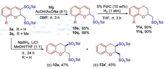 To obtain more insight into the synthetic utility of the obtained annulation products, studies on selective reduction in the functional groups were carried out. As shown in Scheme 5, treatment of 3a or 3q with magnesium powder and a buffer solution of AcOH/AcONa in DMF could smoothly remove the conjugated sulfone group, whereas the methylene sulfone group survived intact. Then, desulfonylated product 10a or 10q could be hydrogenated using Pd-C/H2 to afford chromane derivative 11a or 11q in high yield. Alternatively, the reduction in the C = C bond of 3a was achieved by using NaBH4 with LiCl as an additive, furnishing chromanes (±)−12a and (±)−12a′ in roughly equal yields.