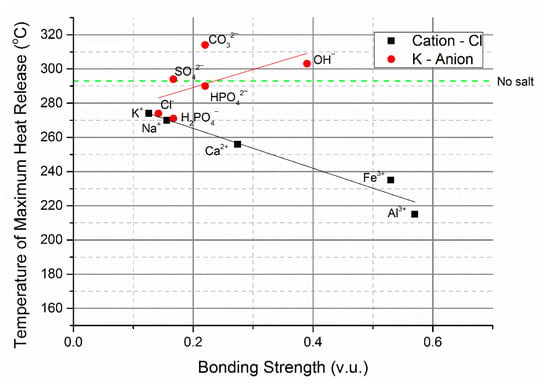The maxima of the exotherms, shown in Figure 1, were compared to the bonding strength of the cations and anions of the added inorganic salts in Figure 2. The bonding strength is a measure of the Lewis acidity of cations and the basicity of anions [61]. The influence of the chloride salts on the temperature of the maximum heat release strongly correlates with the bonding strength of the cation. Starting pH of the reaction medium was a less important factor-FeCl3 solution (pH 1.69) had a lower pH than AlCl3 (pH 3.67) yet demonstrated a lesser effect on the temperature of maximum heat release. Despite the lower concentration of the iron and aluminium chloride in solution (to preserve the crucibles) compared to the three neutral salts, the influence on the temperature of maximum heat release was greater. FeCl3 had a slightly smaller influence on the temperature of maximum heat release, possibly because the iron reduces during the reaction, as has been reported by Zhang et al. [62]. The effect of H+ was measured but was not reported in Figure 2 because its small size causes asymmetric two coordination with one strong bond of 0.8 valency units (v.u.) and one weak bond of 0.2 v.u. [63]. For this reason, H+ is an exceptional cation.