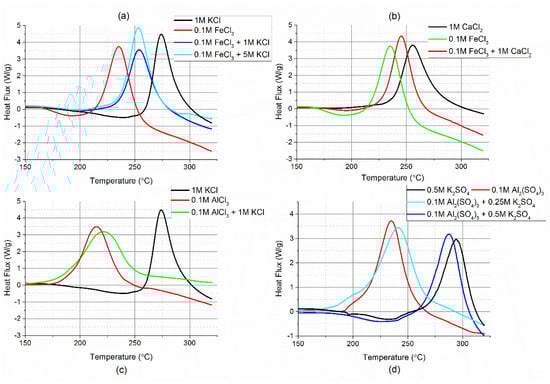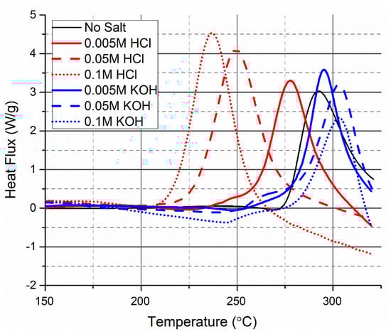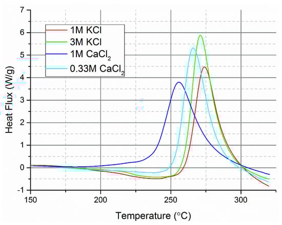 The ionic strength of the reaction medium has been identified to influence the hydrothermal carbonisation process [67]. Increasing the concentration of potassium or calcium chloride was found to decrease the temperature at which exothermic reactions occur (Figure 4). When the ionic strength of solutions with the two different salts was balanced (e.g., 3M KCl and 1M CaCl2), the measured heat flux by DSC was different, further showing that Lewis acidity was the major determining factor on the temperature onset of carbonisation. The findings are similar to those reported in Jung et al. [68] which found that quadrupling the concentration of KCl had only a minor effect on the reaction rate constants of HMF conversion to hydrochar and levulinic acid. The presence of CaCl2 instead of KCl was found to greater increase the reaction rate constants compared to quadrupling the concentration of KCl.