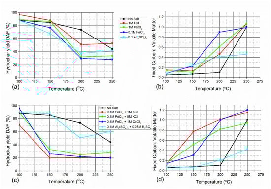 Hydrochar mass yields on a dry ash-free basis (DAF) and the ratio of fixed carbon to volatile matter of the produced hydrochar. (a,b) hydrochars produced in the presence of a single salt, and (c,d) produced with a combination of two salts.