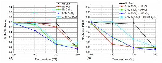 H:C molar ratio of hydrochars with (a) a single salt, and (b) two salts combined.