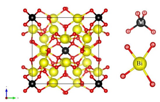 Those phenomena can aid the photocatalytic activities in Bismuth-based semiconductors. Within the bismuth semiconductors category, the most exciting class is that of sillenite crystals. These crystals have attracted a great deal of scientific attention because of their unique structure of crystals [33], high photorefractive [38,39] and photochromic properties [40], dielectric properties [41], electro-optic properties [42], fast response [41,43], long optical storage time in the dark [44], recyclability, and narrow band gap (<2.9 eV) [36,45]. Recently, sillenite-type materials have been widely applied in a number of applications such as optical data processing and storage, electro-optics, acoustics, peizotechnics, optoelectronic, electronics, fiber optic sensor, image amplification, real-time and multiwavelength hologram imaging, metrological problems, and a variety of photocatalysis applications [46,47,48,49,50]. Bismuth oxide crystals with the sillenite structure, as defined by the general formula Bi12[M]O20 (BMO), where M is the tetravalent ion of the elements from II–VIII groups of the Periodic Table, are a body-centered cubic crystal structure with the space group I23 [51,52,53]. Figure 1 shows the crystal structure of the perfect Bi12MO20 sillenite and local structure around the Bi and the M sites. The general structure of the BMO structure is described by a bismuth atom (Bi3°) surrounded by eight oxygen atoms that share corners with other comparable polyhedra BiO8 and tetravalent ions MO4 that occur both at the cube center and on the corners of the cube [54,55,56,57,58,59,60].
