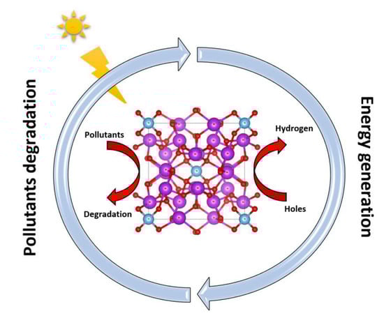 As one of the AOP techniques, photocatalysis is one of the best approaches, as it very efficiently opens new avenues for addressing global energy needs and pollution issues [23,24]. It has aroused the interest of the scientific community in recent decades, particularly as one of the most effective applications for the removal of organic and inorganic pollutants [25]. It is also known that photocatalysis is capable of producing chemical reactions that are highly thermodynamically demanding that would otherwise require energy-intensive inputs in terms of an elevated temperature (or pressure), which are potentially beneficial in energy generation and environmental cleaning applications [26]. Issues directly related to human health and environmental health such as the purity of water and air can be effectively addressed through photocatalysis as it will be one of the most important future technologies for all kinds of photocatalysts in the field of environmental treatment [27]. Heterogeneous photocatalysis using semiconductors as catalysts is more efficient in environmental applications because they are very efficient, easy to produce, and use a heterogeneous process that makes it easy to separate them from water [24,28]. Semiconductors also have other properties suitable for photocatalytic reactions, such as their optical absorption characteristics, their electronic structure, and the capacity to form charge carriers when energized with a light source by transforming light energy into chemical energy [17,21]. Highly effective and eco-friendly metal oxide semiconductor types have been developed. For example, TiO2 (Yao et al. 2003b) is widely considered the most photoactive of all catalysts. However, TiO2’s disadvantages, such as its high photo-generated electron–hole pair recombination rate and poor irradiation sensitivity due to its large energy band gap, limit its practical applicability [29]. To overcome these obstacles, it is necessary to develop innovative, efficient, and multifunctional semiconductors with excellent photocatalytic activities, an appropriate photo-generated pair recombination rate, and a low band gap [30,31,32].