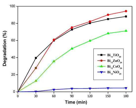 Based on our recent research that dealt with the characterization and application of the sillenites Bi12TiO20 (BTO), Bi12CoO20 (BCO), Bi12ZnO20 (BZO), and Bi12NiO19 (BNO) for environmental applications, it is now feasible to compare their efficiency in terms of pollution removal. All those sillenites were synthesized by the sol-gel method, and the detailed method for each material can be found in the following works [25,34,58,70]. Cefixime (CFX) was chosen as the target pollutant since it was used in most of those works. A comparative test was conducted using the sillenites BTO, BCO, BZO, and BNO in order to remove CFX antibiotics from water. The photocatalytic tests were carried out in a double-walled stirred reactor (batch). The photocatalytic conditions were chosen based on past research [25,70], with a concentration CCFX = 10 mg/L, pH ~ 6, T = 25 °C, and dose of catalyst = 1 g/L. Before exposing those tests to irradiation sources (UV light), all sets were combined in the dark for 120 min to avoid the adsorption effect and establish the adsorption–desorption equilibrium. Figure 3 demonstrated the CFX degradation tests using those sillenites under the same conditions. As observed, CFX degradation using BZO and BTO as catalysts achieved almost relative efficiency of 94.34% and 88.07%, respectively, within 180 min, while this was lower for the others. The sillenite BCO has also shown a good degradation performance, giving 71.23% within 180 min. However, the sillenite BNO has shown a very low degradation efficiency for CFX, although it has given a very efficient degradation for Basic blue 41. The low efficiency of the sillenite BNO may be explained by the fact that BNO photodegradation can be enhanced in the basic condition [58]; however, CFX photodegradation is favored in the neutral medium of approximately 6 [25]; therefore, the two are incompatible. This phenomenon may be due to the surface charge of both the catalyst and the pollutant. The differences in the efficiency of each sillenite may be due to the color and gap energy of the catalysts, which provides a higher level of light absorption for both BTO and BZO in the range of 200–600 nm, which is very close to the UV region. The degree of crystallinity and the purity of the phase also play a major role in determining the efficiency of the catalyst. In the end, BZO proved to be the most efficient catalyst for the removal of CFX, with a degradation rate of 94.34% in just 3 h.