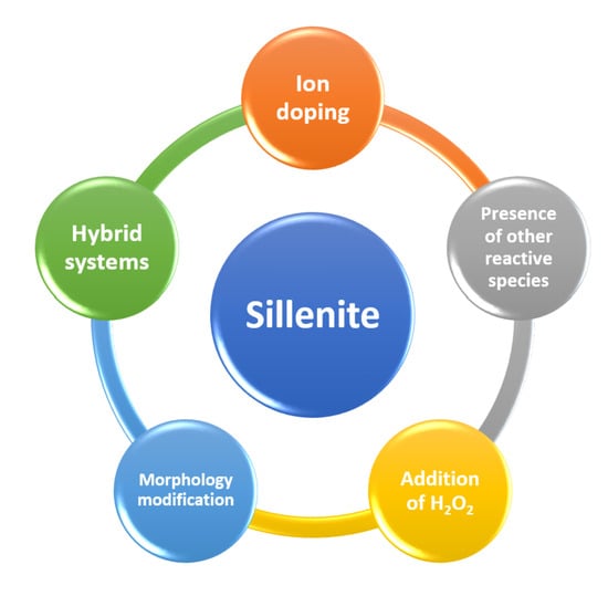 Several strategies can be utilized to improve the photocatalytic activity of these interesting sillenites, such as ion doping, the presence of other reactive species, the addition of H2O2, hybrid systems, and morphology modification (Figure 4). However, only a few studies of sillenites as photocatalysts coupled with other strong oxidants have been published, leaving a gap in our knowledge of these important materials. This section will address some of the available references in this field.