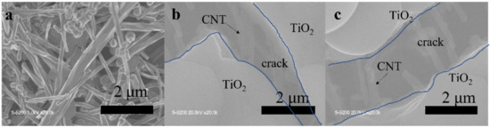 Scanning electron microscopy (SEM) images of: (a) CNTs and (b) and (c) prepared T-C film containing cracks.