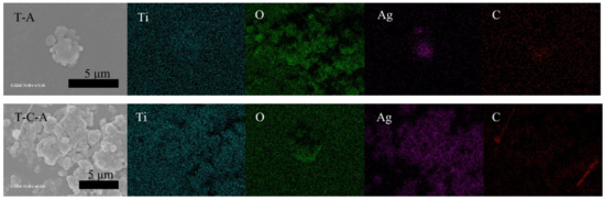 The TiO2, TiO2-CNT, TiO2-Ag, and TiO2-CNT-Ag films were generated by supplying only TTIP, a TTIP and 0.25 wt% CNT suspension, a TTIP and 0.1 wt% Ag suspension, and TTIP and CNT/Ag mixed suspensions (0.25 wt%/0.1 wt%). The corresponding products are denoted as T, T-C, T-A, and T-C-A0, respectively. The morphology of the CNTs is shown in Figure 1a. Figure 1b,c shows the scanning electron microscopy (SEM) images of the prepared T-C films containing cracks. The cracks sometimes appear on the periphery of the annealed film surface, which could be attributed to the heat treatment. The CNTs are exposed, confirming their successful incorporation into the film. Further, the morphologies of the prepared T, T-C, T-A, and T-C-A films are shown in Figure 2. Figure 2a–d show the cross-sectional morphologies of the films, which are apparently dense with a quasi-uniform thickness of approximately 1 μm. The addition of CNTs and Ag does not affect the film thickness. Compared to the T films, the CNTs are attached to TiO2 on the surfaces of the T-C and T-C-A0 films (Figure 2b,d). Only a few CNTs are observed, which can be attributed to the effective dispersion of the CNT suspension during deposition. However, the presence of Ag nanoparticles is not confirmed in the T-A and T-C-A0 (Figure 2c,d) films. The cross-sectional images of the TiO2 film show that it consists of large columnar grains. This leads to the formation of a relative regular surface, as shown in Figure 2e. However, with the supply of CNTs and Ag particles, some parts of the film surface become irregular, like the strip structure in Figure 2f, large aggregate particles in Figure 2g, and both phenomena in Figure 2e. The use of additives may lead to the growth of a core-shell structure, which results in the deposition of an irregular structure. In addition, we performed element mapping of the irregular structure that appeared in the other samples prepared under the same conditions (Figure 3). The results confirmed the presence and distribution of Ti, O, Ag, and C. The aggregated particles consisted of Ag and TiO2, and the strip structures consisted of CNT and TiO2. Thus, the results, confirmed that TiO2 was embedded with CNTs and Ag nanoparticles. Furthermore, the influence of different concentrations of the CNT/Ag mixed suspensions, such as 0.25 wt%/0.05 wt%, 0.25 wt%/0.01 wt%, 0.01 wt%/0.1 wt%, and 0.5 wt%/0.1 wt% concentrations, on the T-C-A films surface was investigated. The products were denoted as T-C-A1, T-C-A2, T-C-A3, and T-C-A4, respectively. The SEM images of these films are shown in Figure 4. From the surface structure observations, the amount of CNTs appears to be strongly influenced by the concentration of the mixed suspension. However, considering that more CNTs were embedded into the films (Figure 1), it was difficult to define the amount of CNTs based on the SEM images. In addition, it was challenging to define the morphology of the Ag particles in all the T-C-A films, which may be due to the existence of the embedded structure and the small size of Ag particles.