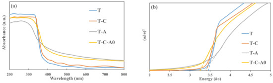 Optical properties of the T and T-composite film: (a) absorbance spectra and (b) (αhυ)2 versus photon energy (hυ) plot of the prepared films.