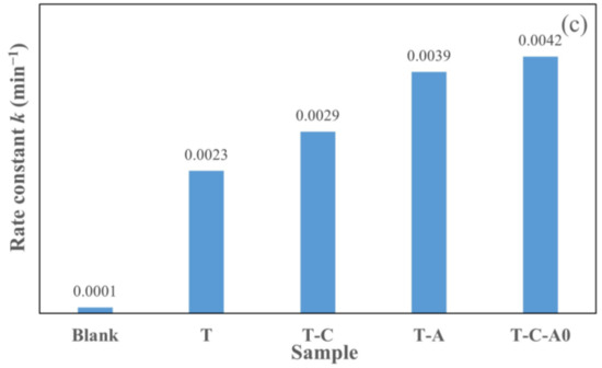 Photocatalytic degradation of rhodamine 6G by T-C-A films annealed at different temperatures: (a) degradation with respect to time, (b) ln (Ct/C0) versus to time plot, and (c) corresponding rate constants of degradation for samples.