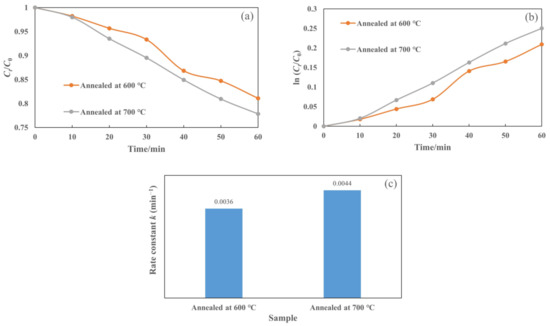 In addition, Figure 10a presents the plot of Ct/C0 as a function of irradiation time for the T-C-A0 films annealed at different temperatures. We also plotted ln (Ct/C0) against t (Figure 10b) to obtain the corresponding rate constant k from the slope of the fitting curve (Figure 10c). The efficiency of the T-C-A0 films annealed at 700 °C for rhodamine 6G degradation is higher than that of the T-C-A0 films annealed at 600 °C, which can be attributed to the phase transfer of the crystalline phase at different annealing temperatures.