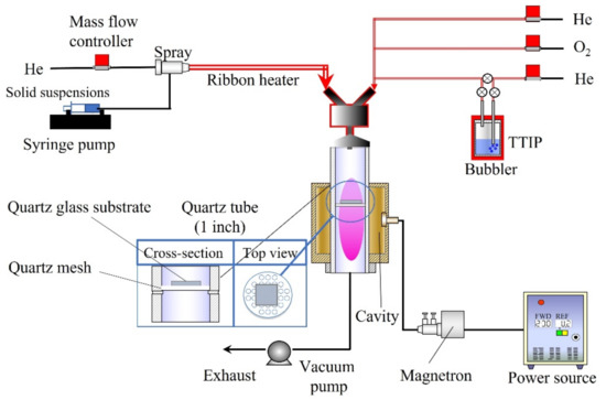 Figure 12 shows the experimental setup consisting of different feeding systems [15,31]. A solid suspension (10 mL) was supplied by a syringe pump (YSP-301, YMC. Co., Ltd., Kyoto, Japan) with a capillary tube. A two-fluid nozzle was used to spray the solid suspension, with He gas flowing at a rate of 1000 sccm. The transport tube was preheated using a ribbon heater to dry the solid suspension. The obtained aerosol particles of CNT/Ag were supplied to the plasma cavity. On the other hand, TTIP (Tokyo Chemical Industry Co., Ltd., Tokyo, Japan) was vaporized in a bubbler (45 °C) with He gas at a flow rate of 50 sccm. Meanwhile, O2 gas with a flow rate of 50 sccm and He gas with a flow rate of 400 sccm were employed to transfer the vaporized TTIP. The quartz tube (inner diameter: 25.4 mm; length: 300 mm) was wrapped and supported by a cavity. Furthermore, we designed a recessed part in the middle of the quartz tube to place a quartz mesh and hold a glass substrate, on which the films could be deposited. The plasma was produced by 190 W microwaves (2.45 GHz) in a quartz tube. A vacuum pump (Pascal 2025C1, Pfeiffer Vacuum, Inc., Asslar, Germany) was used to maintain all the equipment under vacuum pressure before feeding and at ~6 kPa after the materials were fed. The films were deposited on a quartz glass plate (1 × 1 cm) through the simultaneous feeding of the TTIP and CNT/Ag suspensions for 15 min. The obtained films were annealed at 600 °C and 700 °C in an N2 atmosphere.