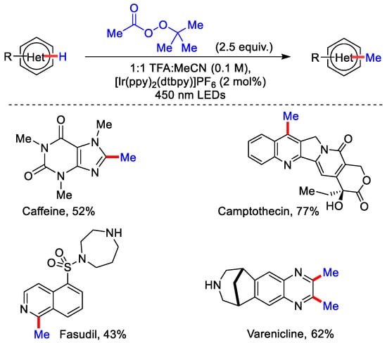Minisci reaction, originally discovered in 1971 by Francesco Minisci, is the introduction of an alkyl group in nitrogen containing heterocyles. However, this strategy was not suitable for complex bio-active molecules due to the involvement of high temperature and strong oxidant. Many groups around the globe tried to solve this problem and came up with modified Minisci type reactions, which increased the practicality of this reaction [23,24,25]. However, even after numerous efforts, small unstable alkyl radicals like methyl, ethyl and cyclopropyl were not compatible. In 2014, DiRocco and co-workers devised iridium catalyzed direct alkylation of nitrogen containing heterocycles using Me, Et, and c-Pr as alkylating reagent. The C−H methylation of various nitrogen containing drug molecules and agrochemicals were performed using tertiary butyl peracetate (t-BPA) as a methyl radical source in the presence of TFA and acetonitrile as a solvent (Scheme 1) [26]. The reaction proceeds at room temperature under the irradiation of 450 nm LEDs.