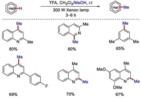 - Liu, W.; Yang, X.; Zhou, Z.-Z.; Li, C.-J. Simple and Clean Photo-induced Methylation of Heteroarenes with MeOH. Chem 2017, 2, 688–702. [Google Scholar] [CrossRef] [Green Version]