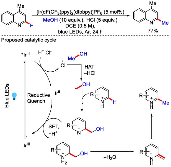 - Zidan, M.; Morris, A.O.; McCallum, T.; Barriault, L. The Alkylation and Reduction of Heteroarenes with Alcohols Using Photo-redox Catalysed Hydrogen Atom Transfer via Chlorine Atom Generation. Eur. J. Org. Chem. 2020, 2020, 1453–1458. [Google Scholar] [CrossRef]