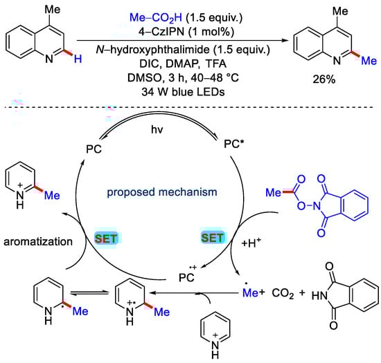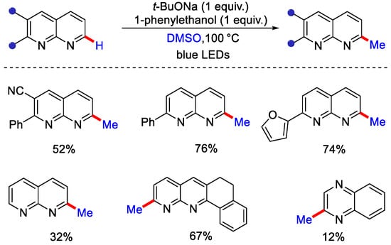 - McCallum, T.; Pitre, S.P.; Morin, M.; Scaiano, J.C.; Barriault, L. The Photochemical Alkylation and Reduction of Heteroarenes. Chem. Sci. 2017, 8, 7412–7418. [Google Scholar] [CrossRef] [Green Version]