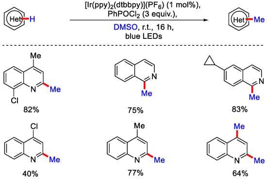 The nucleophilic attack of methyl radical on the protonated heteroarene leads to the formation of radical cation intermediate, which undergo further reaction. This results in the formation of enamine structure, which after tautomerization gives the desired methylated product. This strategy was well applied on medicinally relevant pyridines, quinolines and isoquinolines. In the same year, Barriault, Scaiano and co-workers also developed metal-free photochemical methylation of quinolines, pyridine and phenanthridines using CH3OH in the presence of UVA irradiation (Scheme 5) [30]. The reaction proceeds without the use of any external photocatalyst. Control experiments suggested that acid and UV LEDs are essential for the reaction. The reaction yield was not affected, even in the presence of air, which indicates that the reaction proceeds via singlet excited state.