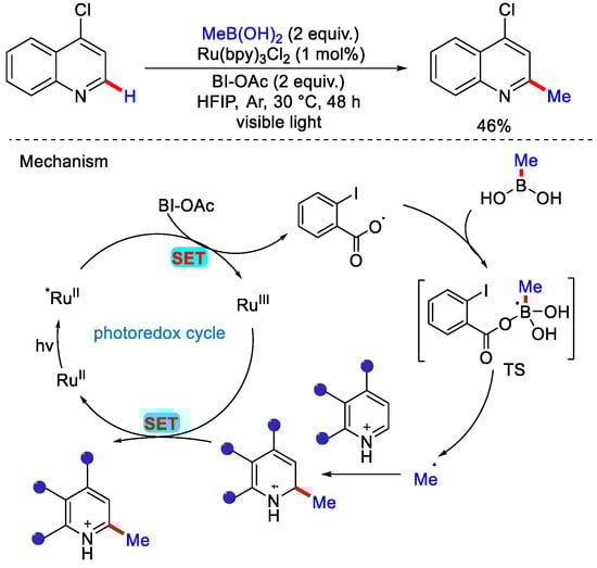 Alkyl boronic acids are also a prime source of alkyl group. They are readily available, moisture insensitive, highly efficient and show excellent functional group tolerance, and have broad applicability. Under the mild reaction conditions, they can be used for late stage functionalization of complex substrates. In 2016, Chen and co-workers showcased the incorporation of 1° and 2° alkyl groups into various N-heteroarenes utilizing alkyl boronic acid as alkylating reagent [39]. Incorporation of 1° alkyl radicals was the challenging task in the traditional Minisci reaction, and was solved by this method. The authors used acetoxybenziodoxole (BI-OAc) as an oxidant, [Ru(bpy)3]Cl2 as a photocatalyst in the HFIP solvent at 30 °C. As per the reaction mechanism, the BI-OAc oxidant was reduced via SET from photoexcited Ru(II)* to form a radical-anion intermediate, which further forms a radical by iodine–oxygen bond cleavage. This radical reacts with boronic acid to form a methyl radical, which then attacks the protonated N-heteroarenes to form σ complex. Then this intermediate gets oxidized by Ru(III), and after deprotonation, methylated product forms (Scheme 14). The major focus of this work was alkylation of heteroarenes, and only one example of methylation of 4–chloroquinoline was reported with 46% yield.