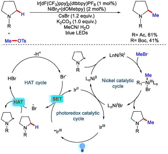 In 2017, the MacMillan group developed methylation of C(sp3)−H by synergistic merger of Photo-redox, nickel and hydrogen atom transfer (HAT) catalysis. For the alkylation, the authors were using quinuclidine for HAT catalysis while a modification was carried out for methylation, as quinuclidine was proved to be harmful for the efficiency of the reaction due to its undesired reactivity with MeOTs. MeOTs and CsBr were used to prepare MeBr in situ. In the tentative mechanism proposed by the authors, bromide anion undergoes in the catalytic cycle to form bromide radical via single-electron transfer (SET) by the triplet excited state of Ir(III), which gets reduced to Ir(II) as shown in Scheme 16 [42].