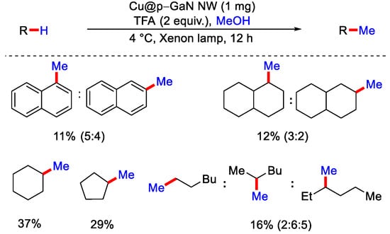 - Liu, M.; Qiu, Z.; Tan, L.; Rashid, R.T.; Chu, S.; Cen, Y.; Luo, Z.; Khaliullin, R.Z.; Mi, Z.; Li, C.-J. Photocatalytic Methylation of Non activated sp3 and sp2 C−H Bonds Using Methanol on GaN. ACS Catal. 2020, 10, 6248–6253. [Google Scholar] [CrossRef]
